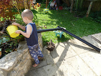Zac could post a ball in the top of the drainpipe and it would roll down the pipe, along the gutter and plop into the carefully positioned bucket ready to be hauled up to begin again. A thoroughly absorbing game for a small boy who liked technical inventions. We had to incorporate Danny's potty to help the bucket find it's perfect loading position, but since Dan was never a fan of sitting on it anyway this was no problem!